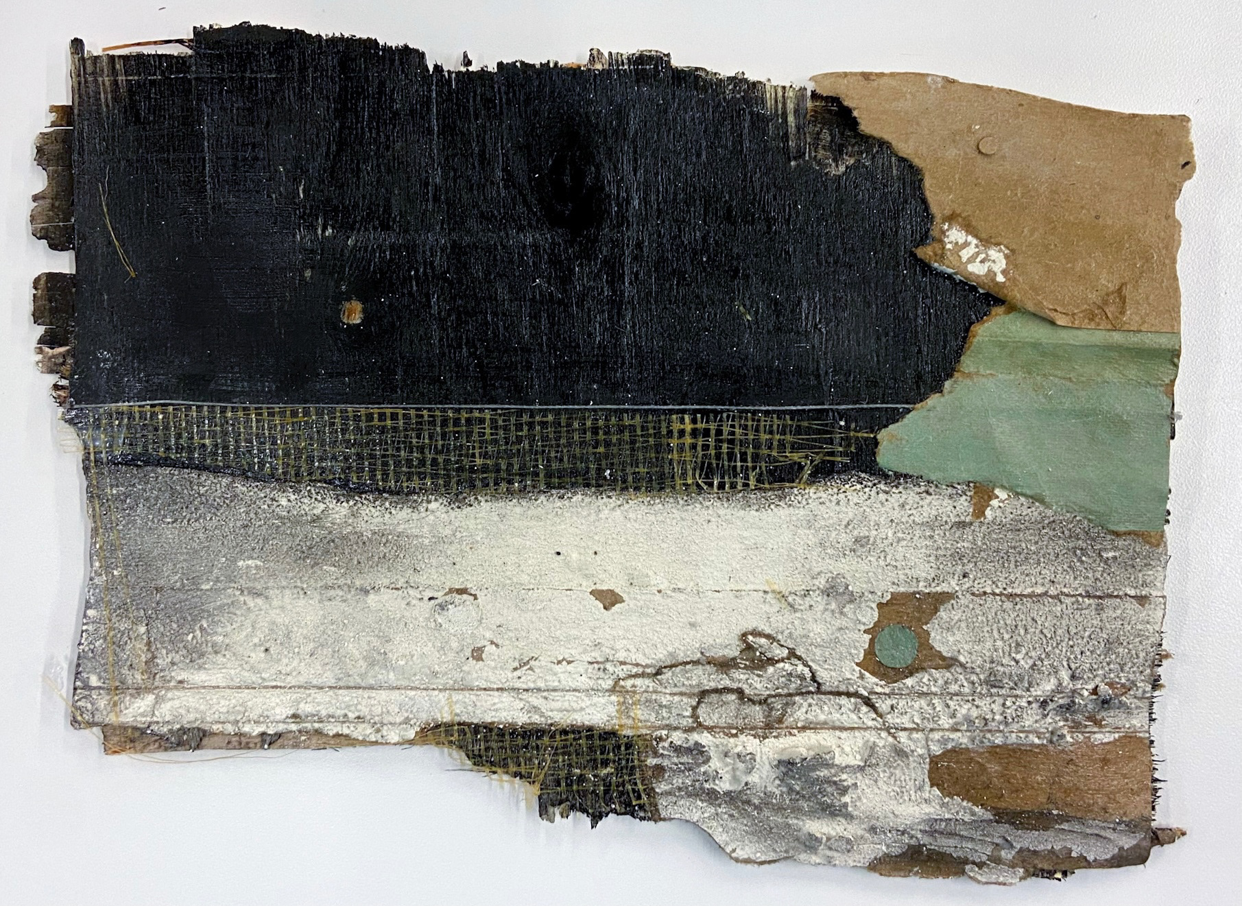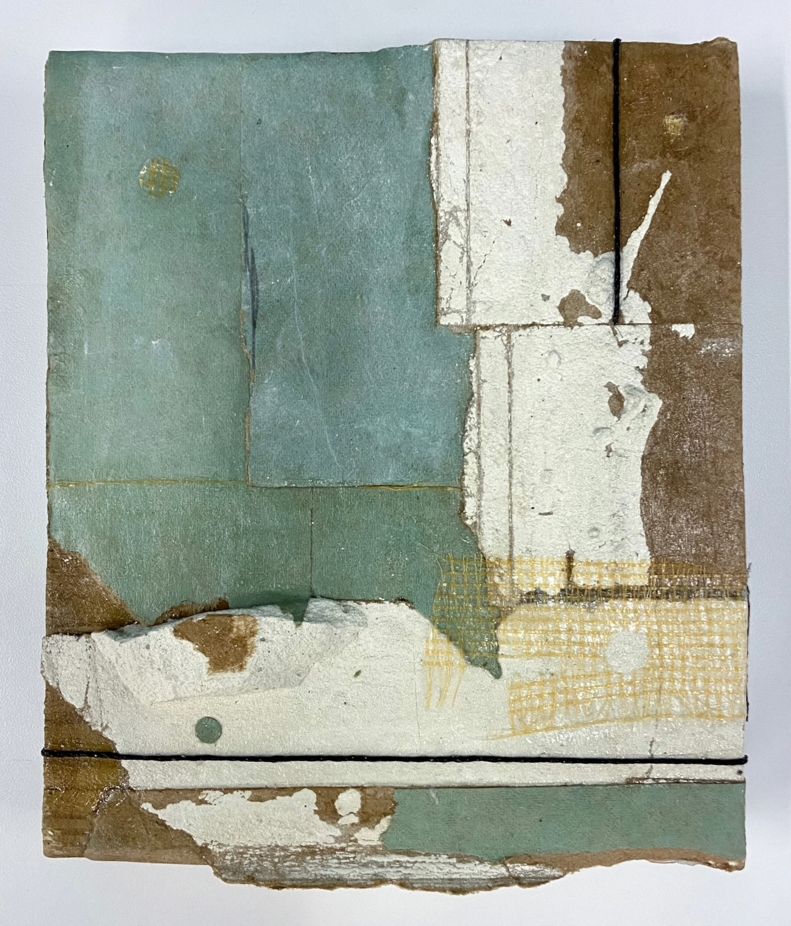 DD. Blue, Found wood tablet, 8” x 10” x 2”, collage with potato sack, hemp string, and wallpaper, 2021