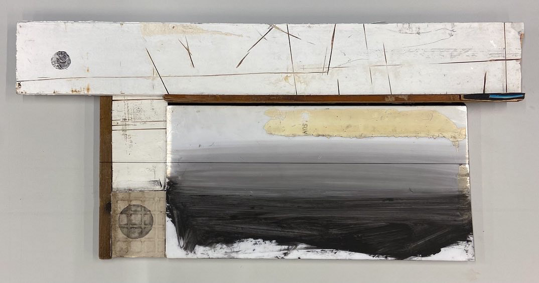 3 Horizons, 24" x 36", found plexi glass, loose canvas, wood, and gesso, 2022