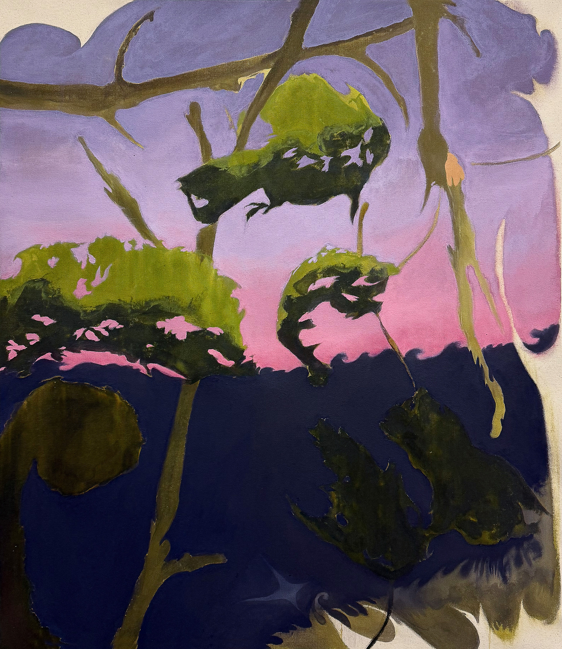 Arrangment of Momentum, "The great tree that forms the backbone of the home", 47"x34", acrylic on raw canvas 2025